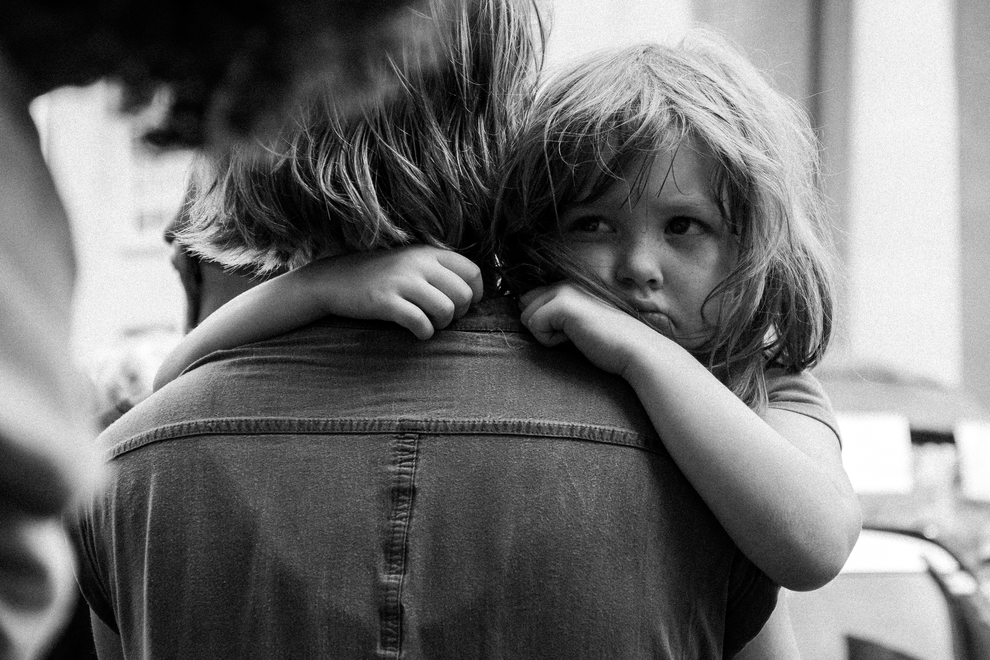 A small girl clings to her mom during the No Kings Day protests in Louisville, KY on Saturday, June 14, 2025.