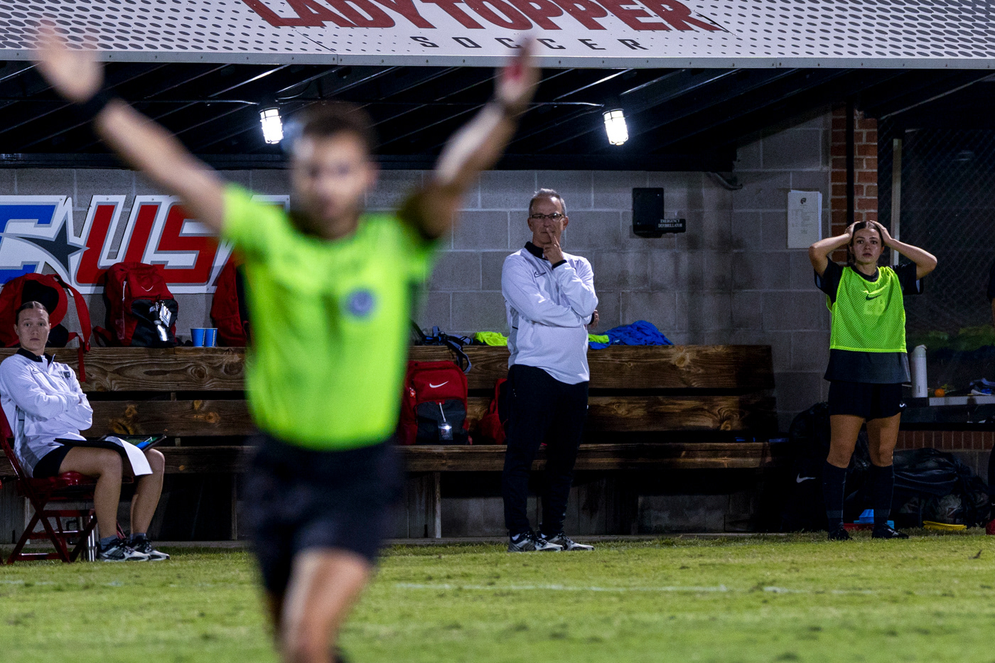 University of Western Kentucky's head soccer coach Jason Neidell reacts to an advantage call by the referee for the play to continue on Thursday, Oct. 16, 2025 during a game against the University of Texas at El Paso at Western Kentucky’s soccer complex in Bowling Green, Ky.